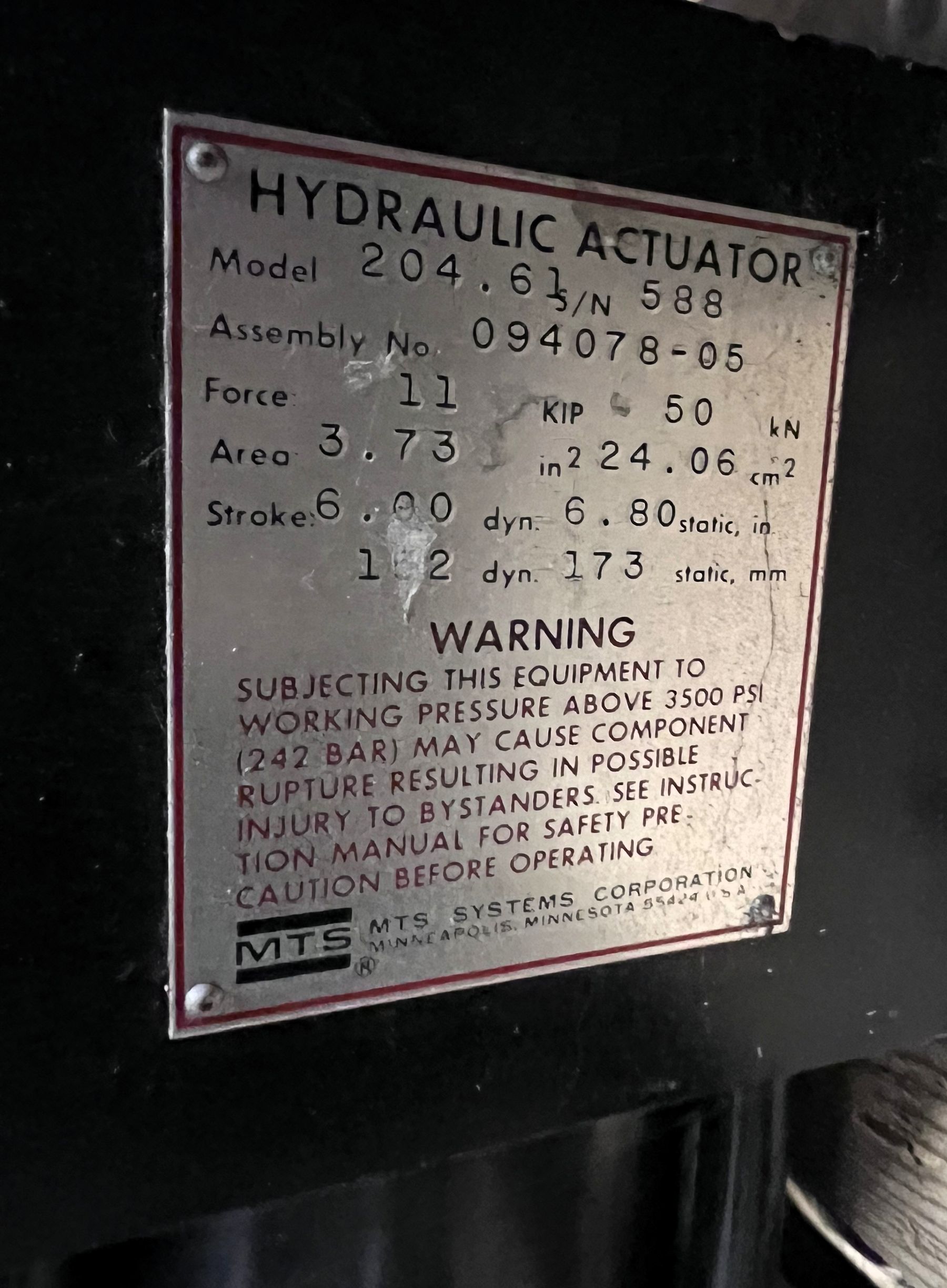 11KIP (50kN) MTS Model 204.61 Hydraulic Actuator