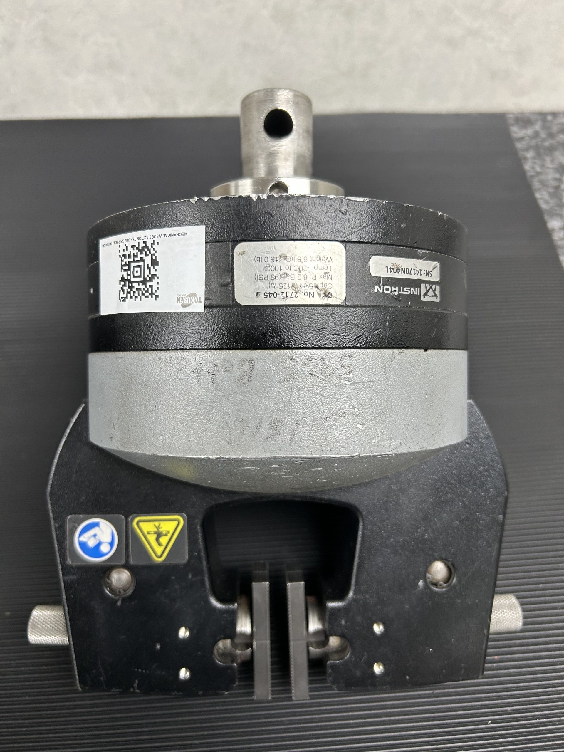 Used Set of Instron 5kN Capacity Model 2712-045 Pneumatic Grips with Serrated Faces, Mounting Hardware and Foot Pedal Switch.