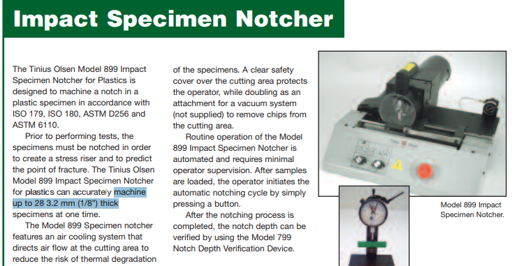 Designed to machine a notch in a plastic specimen in accordance with ISO 179, ISO 180, ASTM D256 and ASTM 6110.